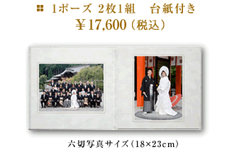 ※集合写真と御二人写真の2ポーズを仕上げした場合、1ポーズの御注文で同じ写真が2枚仕上がりますので、上記見本の場合の料金は17,600円×2ポーズ=35,200円となり、2冊仕上がることになります。